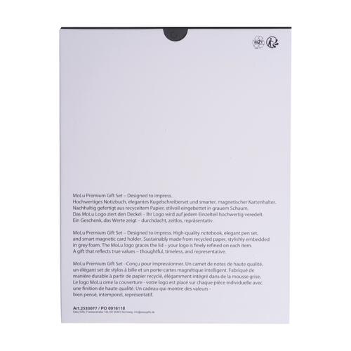 Les objets publicitaires de MOLU sont bien plus qu’un simple cadeau. Du moment de l’unboxing à leur utilisation écoresponsable, ils sont synonymes de luxe et de modernité, et une preuve d’estime très originale. Ce set cadeau premium de MoLu rassemble un carnet de notes, une parure de stylos élégante et un support de cartes magnétiques dans un coffret stylé qui fera impression.